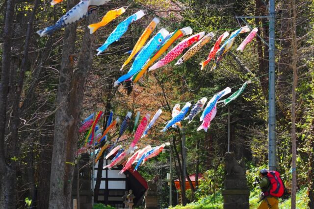 温泉街上空に掲げられた約400匹の鯉のぼりを観覧できます。5月中旬には春紅葉(はるもみじ)も見頃を迎えます。春紅葉は、葉が緑要素を蓄える前に黄色やピンク、オレンジなどの色が見える現象で、新芽の淡い色彩が特徴です。鯉のぼり募集も行われ、家庭や職場で不要になった鯉のぼりを受け付けています。